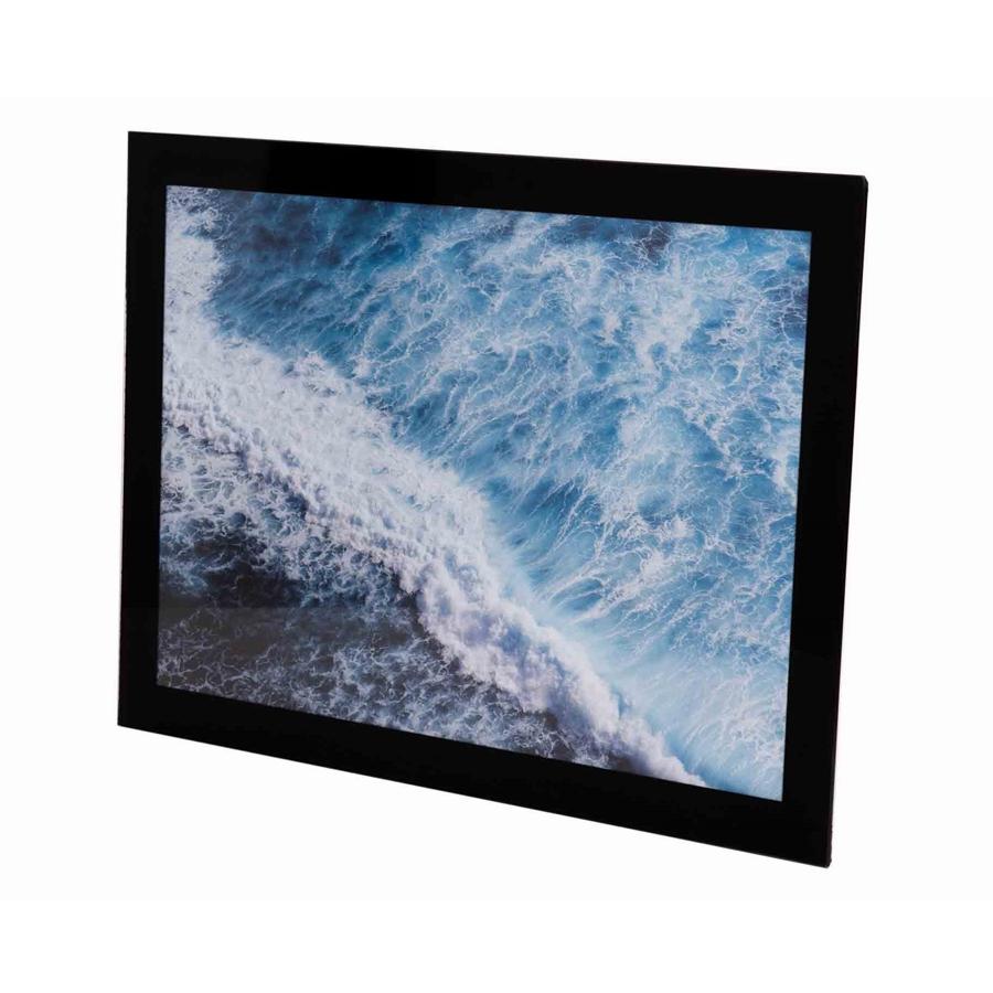 Teljesen üveg felületű, fekete szegélyű fotókeret; falra akasztható.