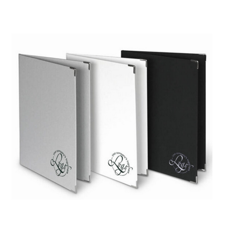 Keménytáblás borító fínom, minőségi bevonattal, fém erősítésű sarkokkal. A belső oldalon négy átlátszó fül teszi lehetővé egy A4 méretű lap - dokumentum, oklevél, emléklap vagy akár étlap - vagy fénykép elhelyezését. Természetesen cserélhető módon.