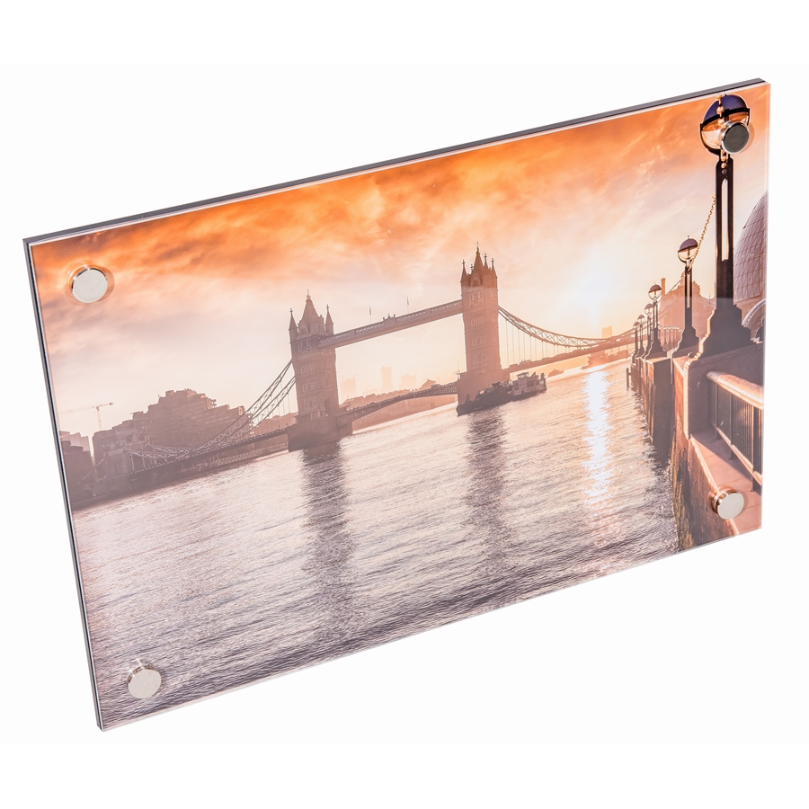 A laborgéppel vagy fotónyomtatóval elkészített szabvány méretű képet csak ráhelyezzük a hátlapra, elrakjuk a kristálytiszta akrillapot, beillesztjük távtartókat és a mágneses 'gombokkal' az előlapon rögzítjük a kompozíciót. A fali akasztót akár fekvő, akár álló formátumú képhez elhelyezhetjük. Az egész összeállítás pár percet igényel és máris kész egy nagyértékű, látványos fali dekoráció. További előny, hogy a konstrukció károsodás nélkül akárhányszor szétszedhető és újra összerakható, tehát a kép akárhányszor cserélhető.