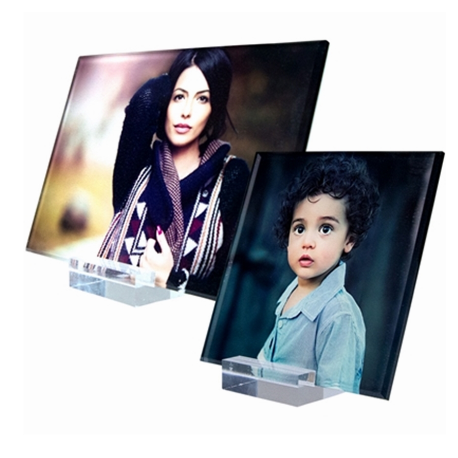 Rendkívül elegáns, látványos, nagyértékű asztali dekoráció. A szabványos méretű fényképet készítsük el laborgépünkkel, fotónyomtatónkkal, majd az akrilkép-alapról távolítsuk el az öntapadós felületet védő fóliát és - egy henger vagy más simítóeszköz segítségével - képpel felfelé ragasszuk az akril lapra. Az ugyanazon akril anyagból lévő asztali állványról is csak le kell szedni a védőfóliát és már át is adható a kész termék.