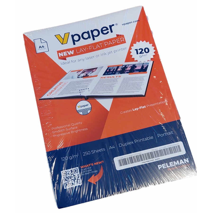 A PELEMAN V-Paper terméke egy különleges eljárással kétszeresen biegelt papír jelent. A kétszeres hajtásnak köszönhetően a papír a kötés gerincéből mindkét irányba tökéletesen hajtható lesz (egyszeri biegelés csak egy irányba biztosít kényelmes, jól fekvő hajthatóságot!). Ennek köszönhetően a V-Paperrel szinte tökéletesen síkban nyitható kiadványok készíthetők - dokumentumok, kiadványok vagy akár fotókönyvek is.
